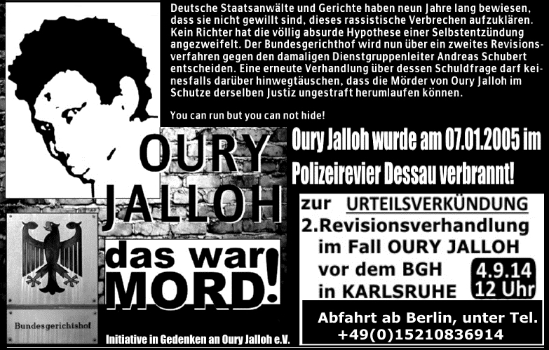 der 4. strafsenat am bgh wird seine entscheidung zur rechtskraft des magdeburger urteils im fall oury jalloh gegen den dienstgruppenleiter andreas schubert am 4.9.2014 ab 12:00 uhr verkünden.