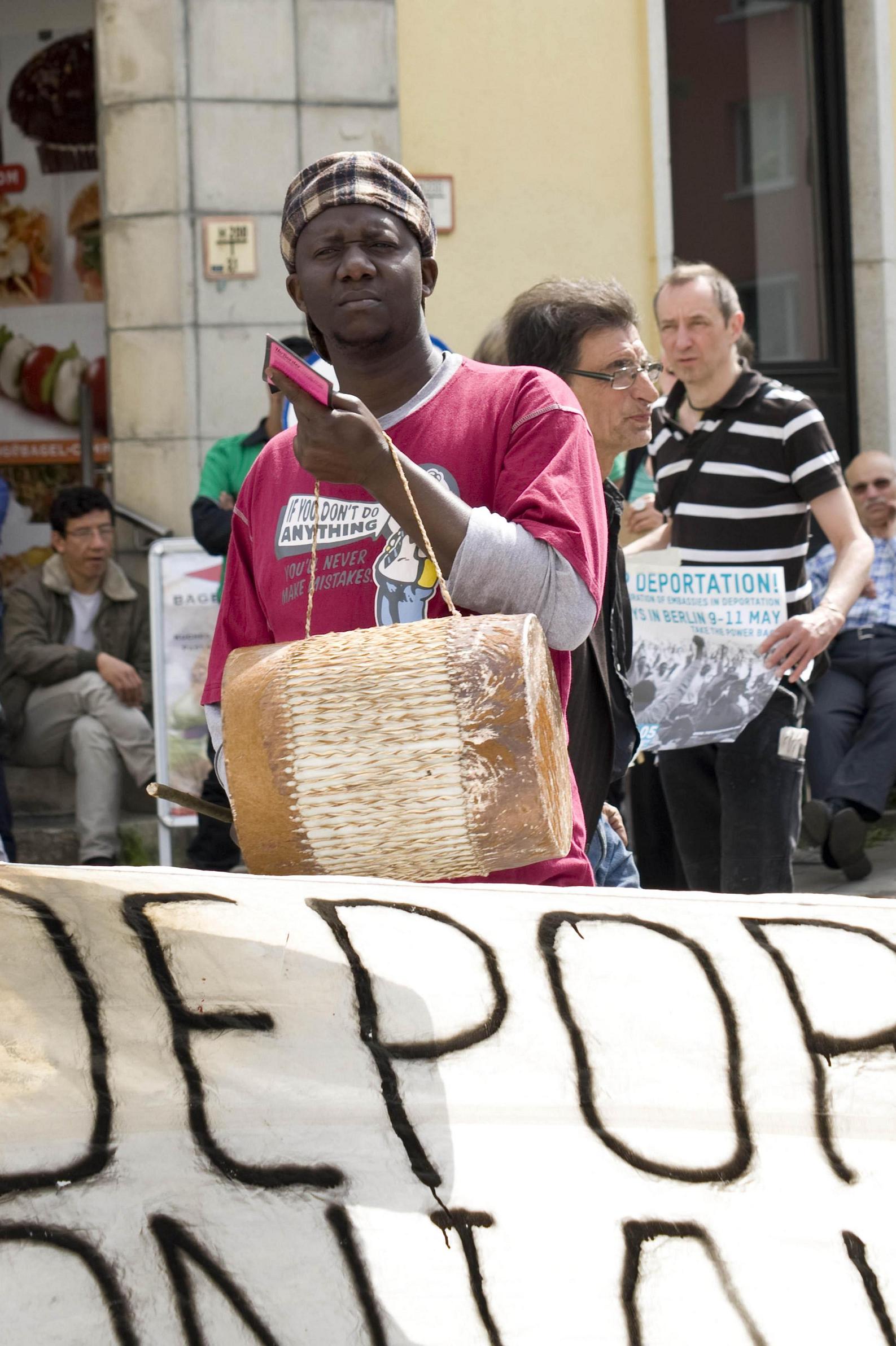 Moses Okile Ebokorait from Augsburg, the Coordinator of the Uganda Refugee Convention 2012 - Drums against Embassy Deportation Collaboration during the action days in Berlin Photo by Adrienne Gerhäuser