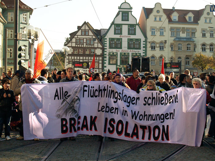 Im Rahmen der Break Isolation!-Kampagne waren am Samstag, 22. Oktober 2011, "ca 1000?!" MigrantInnen, Flüchtlinge und AktivistInnen aus dem gesamten Bundesgebiet gemeinsam mit vielen UnterstützerInnen in Erfurt auf der Straße.