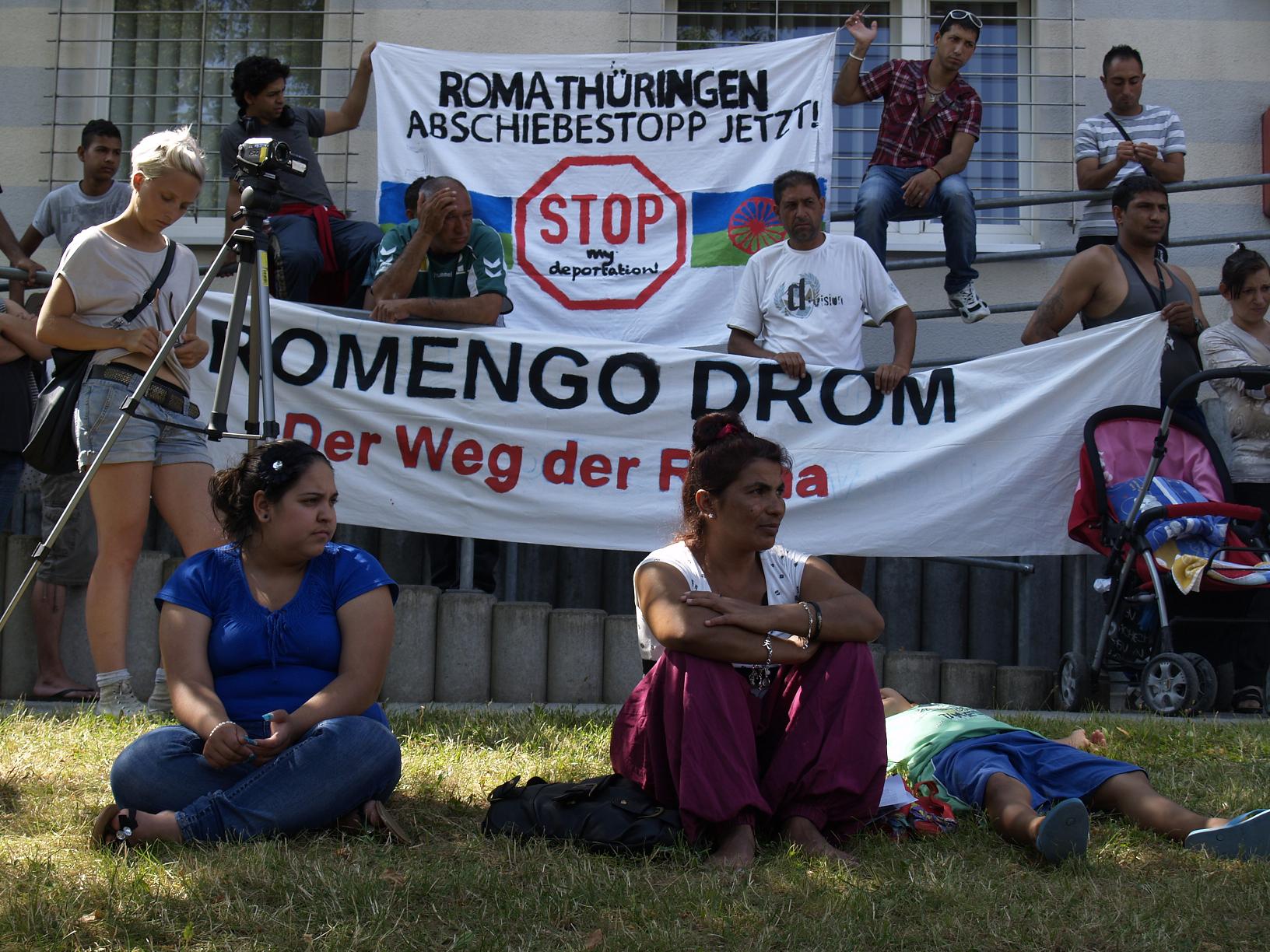 Wir, Roma aus den verschiedenen Regionen Thüringens, organisieren uns nach verschiedenen Beratungen mit den Roma-Communitys in Erfurt, Waltershausen und Gera seit dem 8. Juni 2013 in den Flüchtlingslagern als Roma aus Serbien, Kosovo, Metohija, Makedonien und Montenegro unter dem Namen „Roma Initiative Thüringen“. Der erste Schritt, um an die Öffentlichkeit zu gehen, heißt “Der Weg der Roma – Romengo Drom”, eine Reihe von Aktionstagen in Jena. Dazu hatten sich Roma aus Jena, Greiz, Waltershausen und Eisenberg versammelt.