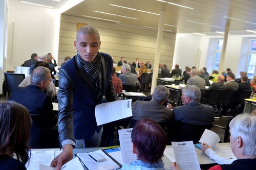Foto: Mahmoud Yassine call for the closure of Bretenworbis refugee camp and distributed the declaration of The VOICE Refugee Foruminitiative Breitenworbis to politicians and the press before the hearing in the district parliament of Eichsfeld in Heiligenstadt on the situation in Breitenworbis 26th of March 2014.