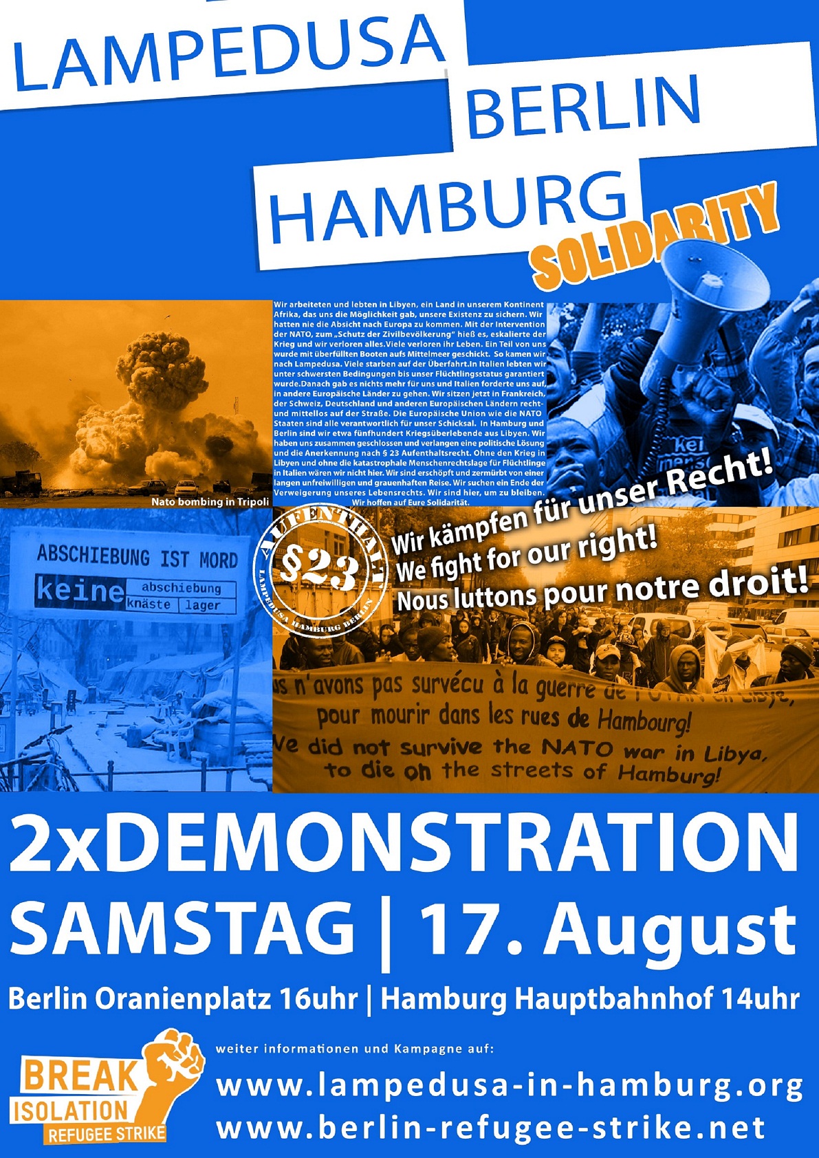 Soon on 17.08.2013 at 2p.m. is the demonstration of lampedusa in hamburg. The refugees from lampedusa in berlin decided to make at the same day at 4p.m. a lampedusa demonstration in berlin in solidarity. with the same demand, to bring more people on the streets of hamburg and berlin - together!